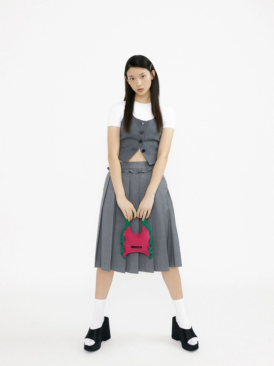 하늘하늘 귀여운 물결 모양의 플리츠 디자인과 톡톡 튀는 배색 컬러가 포인트가 되어주는 제품입니다.