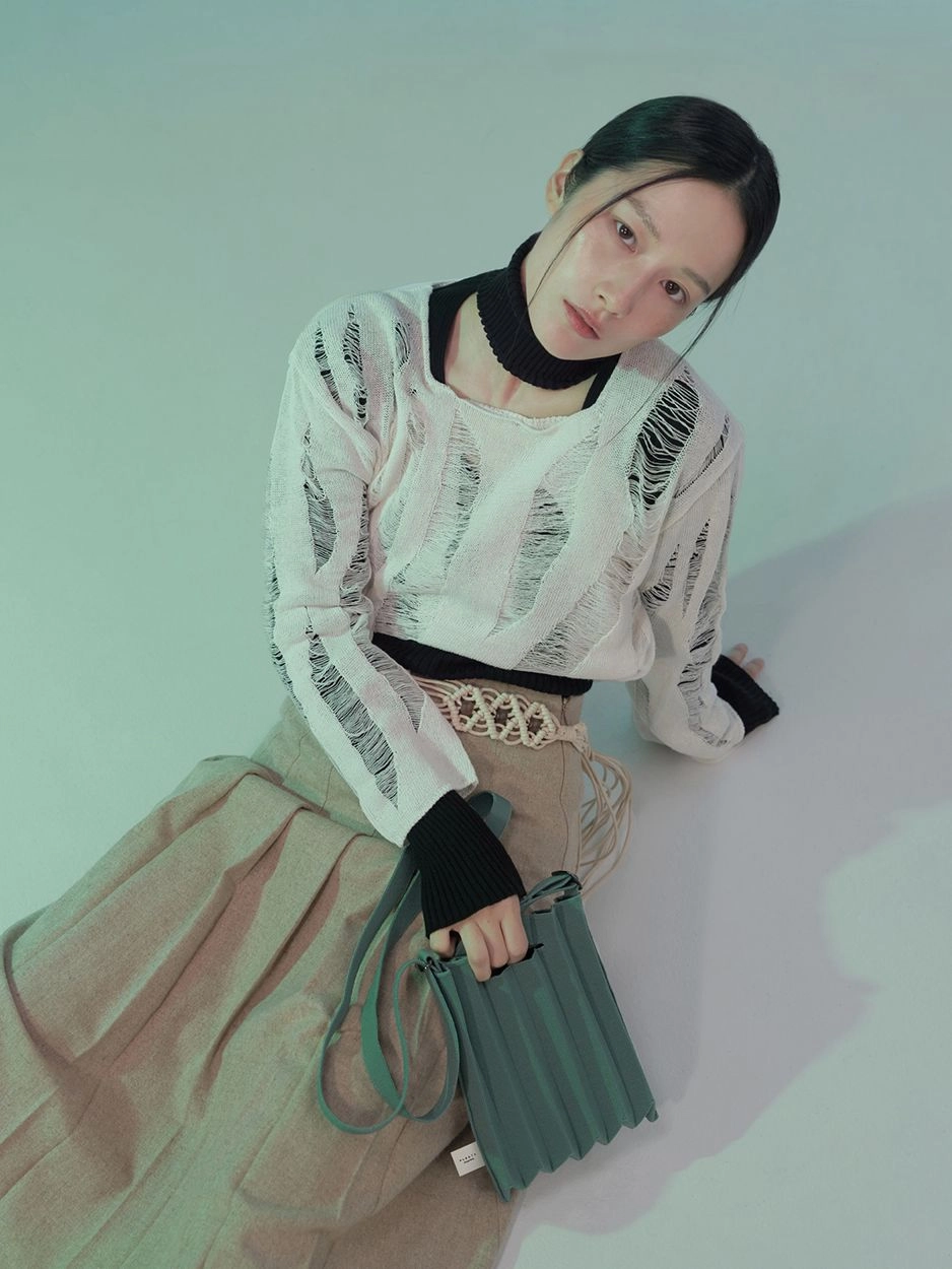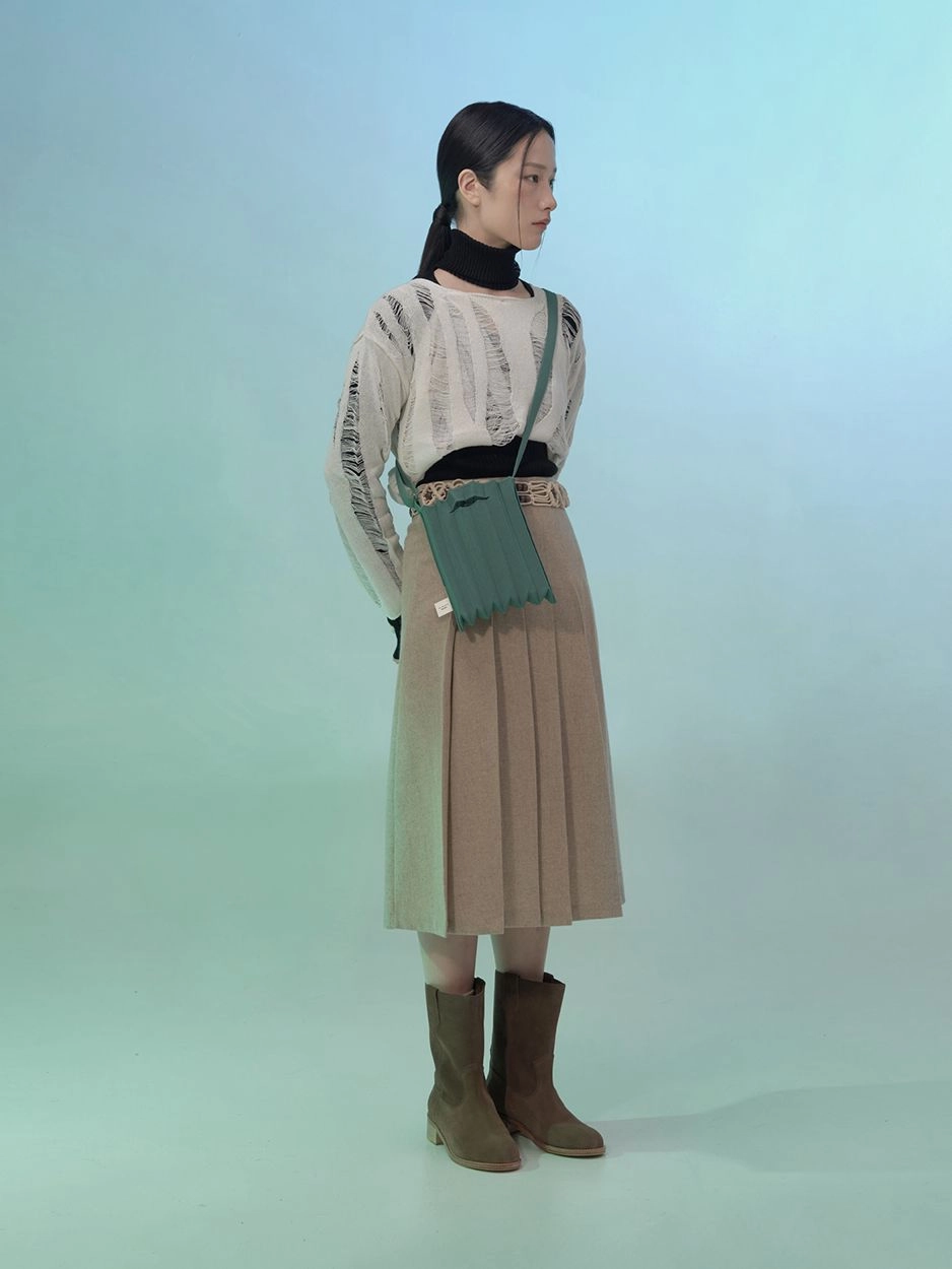 * 니트와 플리츠 디자인 특성상 제품의 가로,세로 사이즈는 유동적으로 늘어날 수 있습니다.